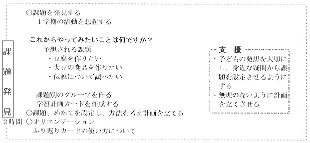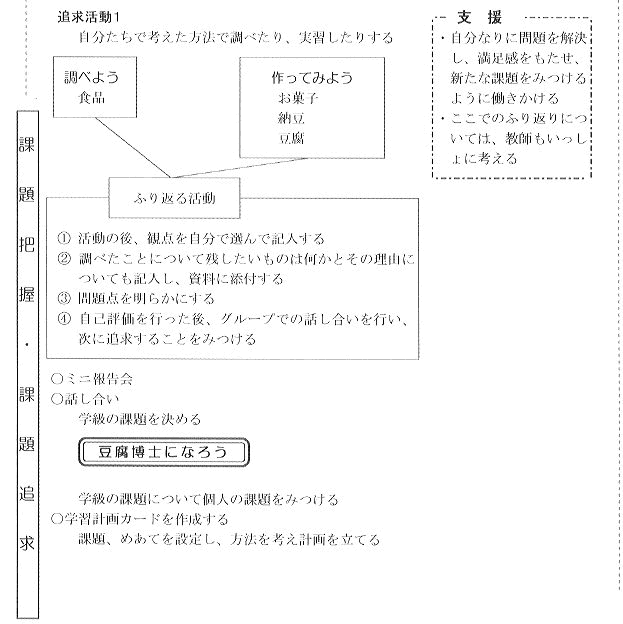 子どもたちは、これまで、理科の発芽実験をきっかけに農園で栽培している大豆について、「大豆博士になろう」と栽培の仕方や歴史、調理方法などについて本で調べる追求活動を行い、大豆についての知識を深めたり、日本の食糧事情を考えたりするようになった。しかし、興味関心をもって追求活動に取り組むものの、その方法が単一的であったり、積極的な児童に頼ったりしがちなところもみられた。