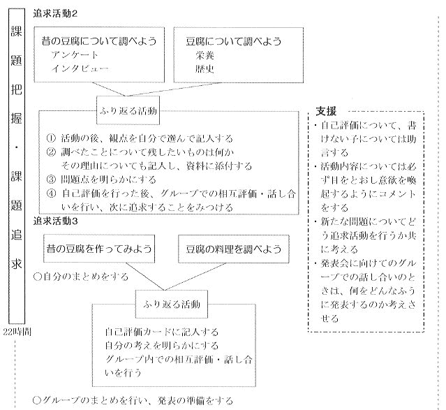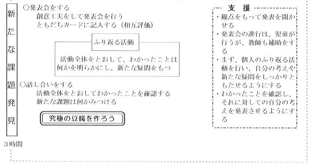本単元では、自分たちの育てている大豆で何かを作りたいという児童の思いを大切にしながら、これらの追求活動から疑問にもったことを本だけでなく、いろいろな方法で追求活動を繰り返すなかで、豆腐に着目させ、実際に作ったり、歴史を調べたりするなかで、日本の代表的食品として発展してきた特徴に気づかせたい。