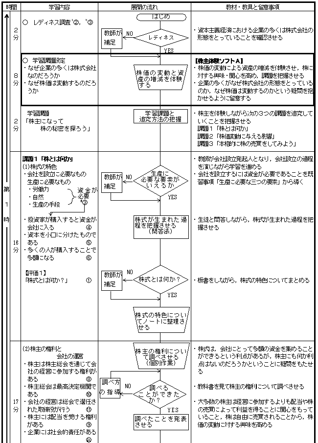 企業は家計と密接に関連しており,将来ほとんどの生徒は企業に労働力を提供し,収入を得て生活するであろう。そういう点では日常生活に密着しており,生徒にとっては身近な題材といえる。特に,「株式会社の仕組み」については,企業の多くが株式会社であることや,株価は現在の経済状況を如実に反映していること。さらに株価の変動が経済に大きな影響を与えていることや,他の経済的分野の学習とも大きくかかわっていることなどから,経済的分野の学習において重要な題材の一つであると考えられる。