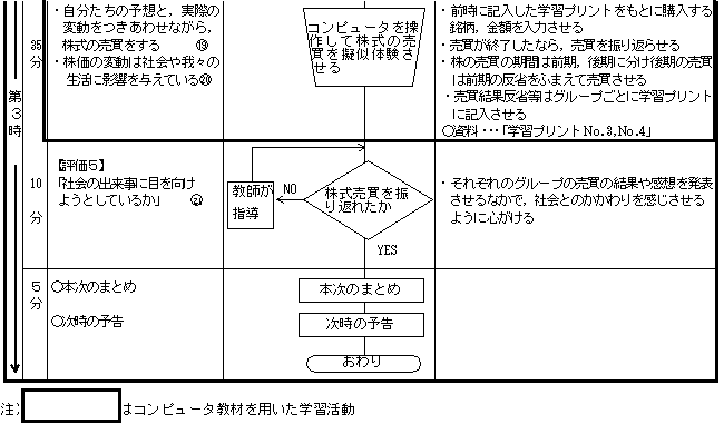 (4) 株式の売買を実際のデータに基づき擬似体験させることにより,経済的に意志決定をする態度を育てるとともに,株価の変動は社会の出来事や経済の動きに関連していることに気付かせ,社会の出来事に目を向ける態度を養う。
